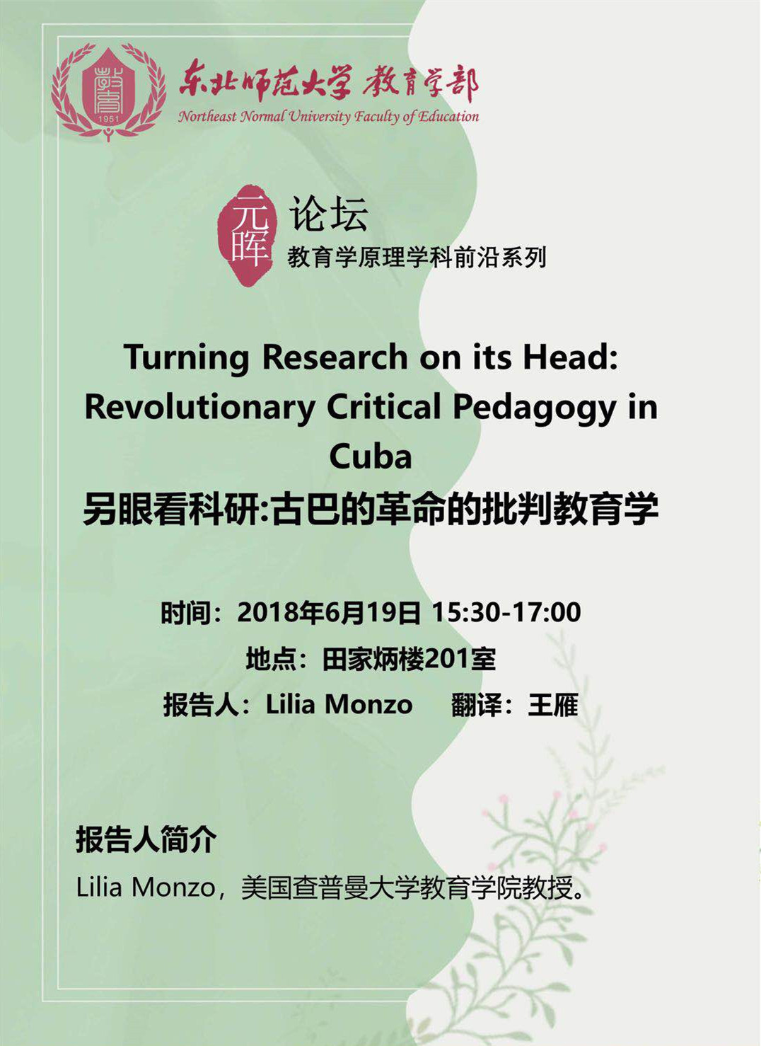 【元晖论坛-教育学原理学科前沿系列】Lilia Monzo:Turning Research on its Head: Revolutionary Critical Pedagogy in Cuba(另眼看科研:古巴的革命的批判教育学)