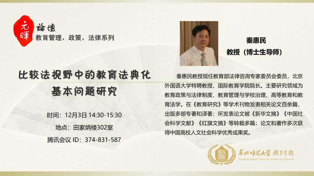 【元晖论坛——教育管理、政策、法律系列】秦惠民:比较法视野中的教育法典化基本问题研究