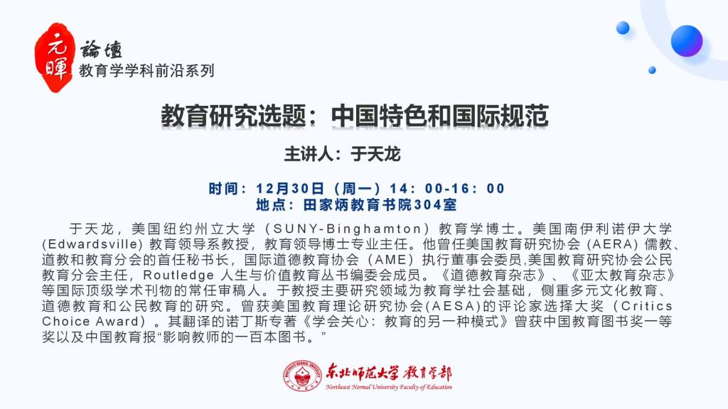 【元晖论坛——教育学学科前沿系列】于天龙:教育研究选题——中国特色和国际规范