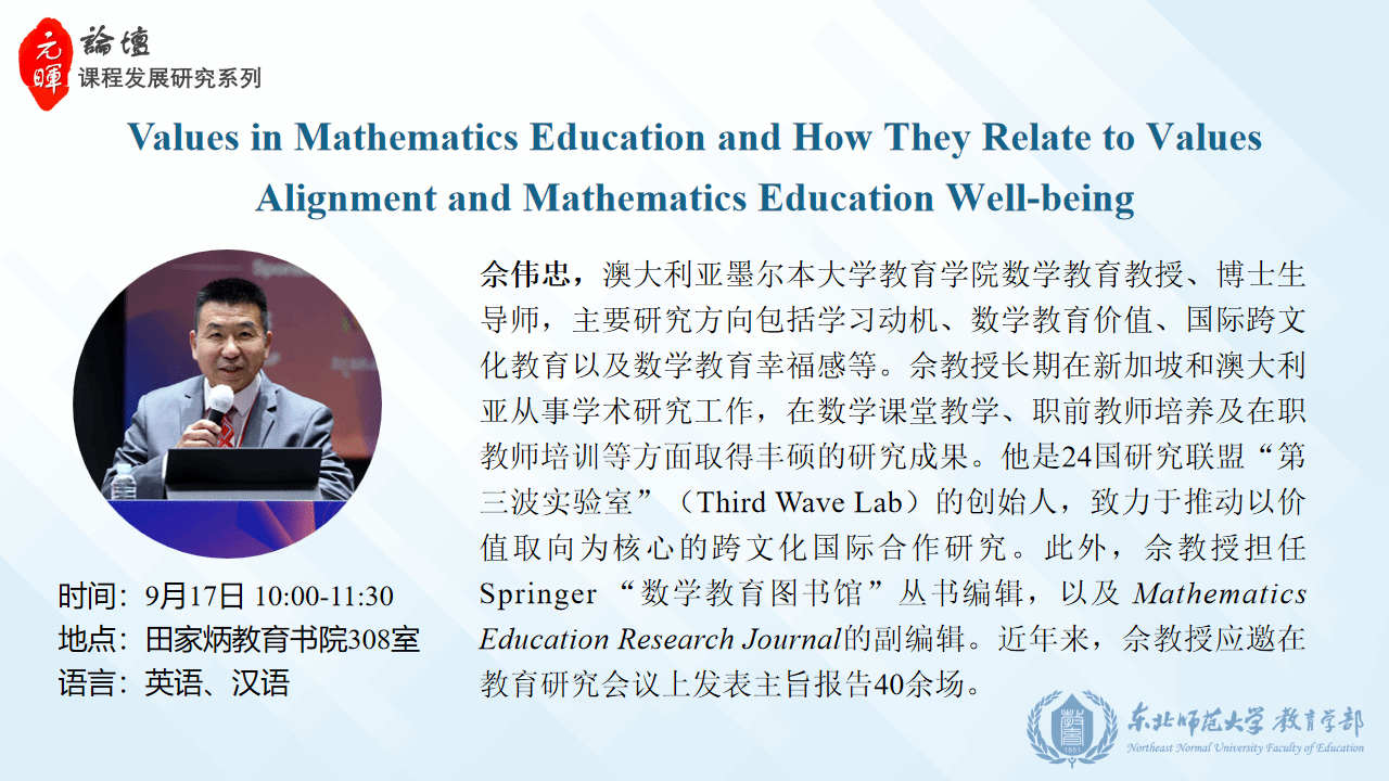 【元晖论坛——课程发展研究系列】佘伟忠:Values in Mathematics Education and How They Relate to Values Alignment and Mathematics Education Well-being
