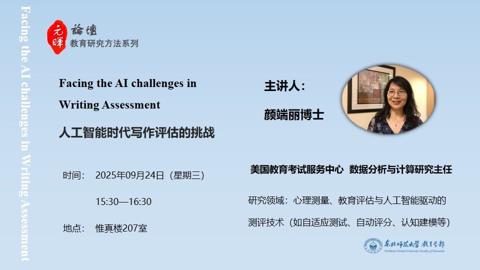 【元晖论坛——教育研究方法系列】颜端丽:Facing the AI challenges in Writing Assessment 人工智能时代写作评估的挑战