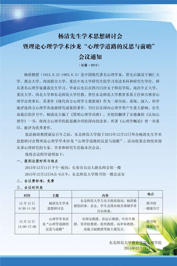 杨清先生学术思想研讨会 暨理论心理学学术沙龙“心理学道路的反思与前瞻” 会议通知