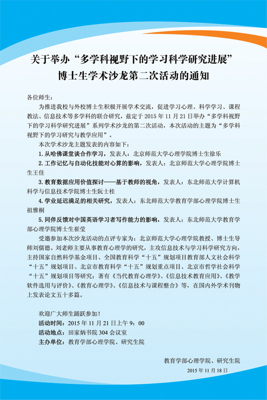 关于举办“多学科视野下的学习科学研究进展” 博士生学术沙龙第二次活动的通知