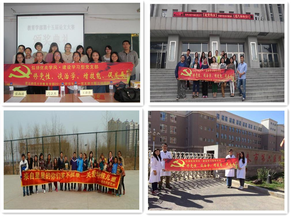 学部2013级研究生第一党支部集聚了9个专业的研究生。自立项以来,该支部结合本支部同志的实际情况,立足于各个专业特色,组织开展了“党史电影展播”、“研究生论文大赛”、“关爱自闭症儿童心理辅导”、“心理医院实践”等一系列趣味性、针对性的学风建设活动。通过学风建设活动,不仅增强了支部同志的党性修养,还提高了支部同志的专业水平和实践技能,并逐渐使支部建设成为一支理论与实践相结合的学习型团队。
