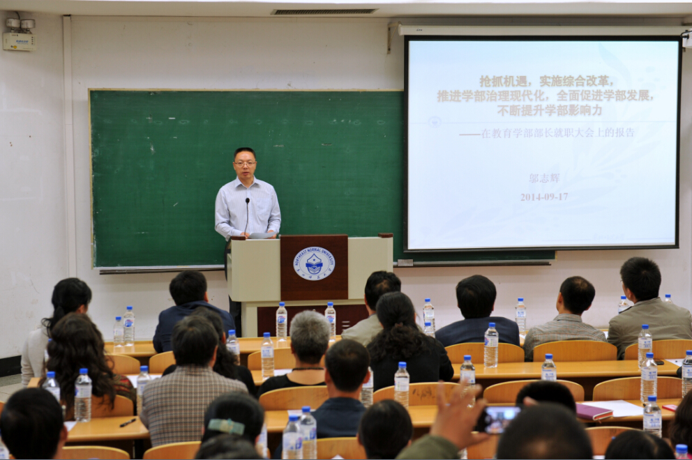 邬志辉教授在发言中表示,担任学部部长,深感责任重大、使命光荣。他感谢学校对学部的高度重视、对他个人的充分信任,感谢学校、学部各位领导和老师对他的培养、指导与帮助,并代表学部全体教职工感谢于伟教授为学部的创建、整合与发展所付出的努力。同时,他根据学校要求作部长就职报告,深刻分析了学部发展面临的形势,详细阐明了未来三年学部改革发展的总体目标、基本思路、具体目标、主要举措以及实现学部发展目标的具体步骤和年度主要工作任务,诚挚希望与各位领导和老师一道携手再创学部新的辉煌。