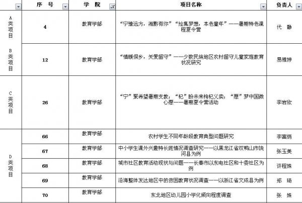 “宁豫远方,湘黔有你”“绘集梦想,本色童年”——暑期特色课程夏令营项目获评学校A类项目,支持资金3000元(全校仅有5个项目获得此项支持);“情暖侗乡,关爱留守”——少数民族地区农村留守儿童家庭教育状况研究项目获评学校B类项目,支持资金1000元(全校共有20个项目);“宁”聚希望暑期支教、“杞”盼未来枸杞义卖、“愿”梦中国微心愿——暑期夏令营活动获评学校C类项目,支持资金500元;“农村学生不同年龄段教育典型问题研究”等5个项目获评学校D类项目。(304永利集团团委)