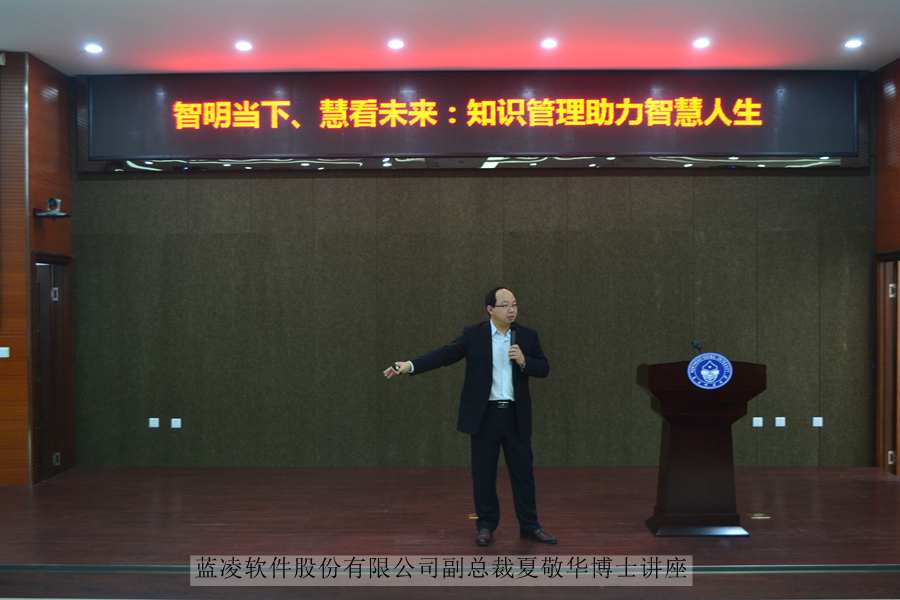 首先,由蓝凌软件股份有限公司副总裁夏敬华带来题为“智明当下、慧看未来:知识管理助力智慧人生”的讲座。围绕知识管理的内涵、发展和应用进行了详细介绍:知识是组织的核心竞争力,在移动互联的新趋势下,知识管理的应用日益多样化,在高校、企业等组织中管理智慧化、场景智能化和运营游戏化三个维度上需要协同创新、共同发力。