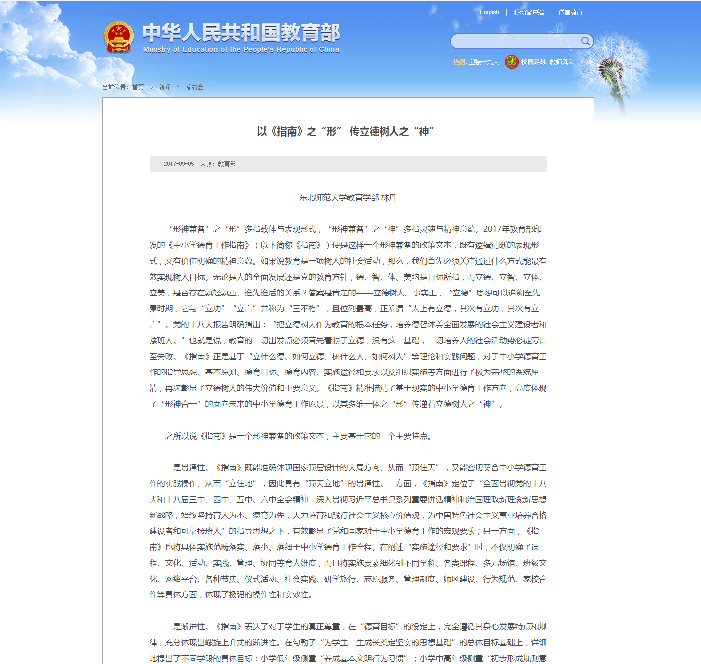 9月5日,教育部召开新闻发布会,介绍《中小学德育工作指南》有关情况。教育部官网实时发表了8位高校学者和9位一线专家的解读文章。学部教育学院林丹副教授的文章《以〈指南〉之“形” 传立德树人之“神”》 获邀刊列其中。
