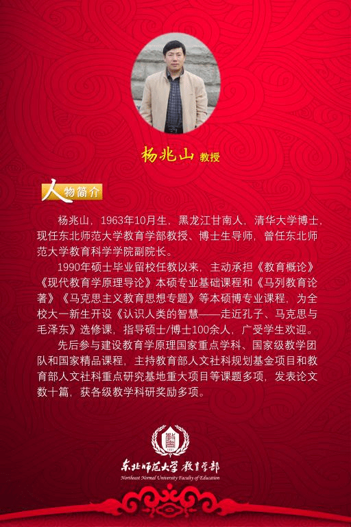 杨兆山教授现为学部教育学院教师、教育学原理专业博士生导师,1990年硕士毕业留校任教以来,主动承担《教育概论》《现代教育学原理导论》本硕专业基础课程和《马列教育论著》《马克思主义教育思想专题》等本硕博专业课程,为全校大一新生开设《认识人类的智慧——走近孔子、马克思与毛泽东》选修课,指导博士硕士研究生100余人,广受学生欢迎。先后参与建设教育学原理国家重点学科、国家级教学团队和国家精品课程,主持教育部人文社科规划基金项目和教育部人文社科重点研究基地重大项目等课题多项,发表论文数十篇,获各级教学科研奖励多项。