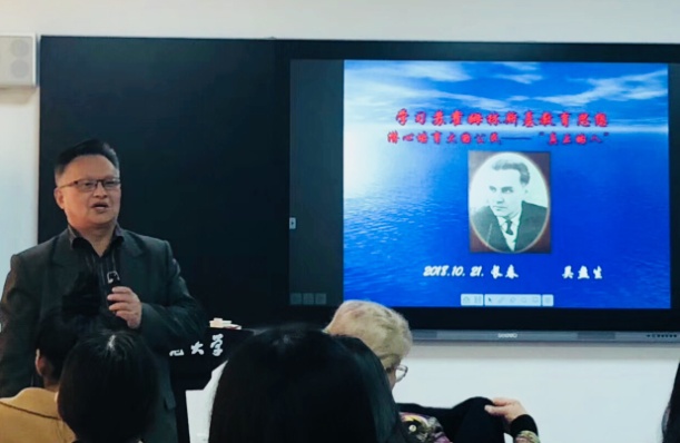吴盘生在题为“学习苏霍姆林斯基教育思想,潜心培育大国公民——‘真正的人’”的报告中,深入介绍了苏霍姆林斯基是怎样的人,系统阐释了苏霍姆林斯基对学校的期望以及苏霍姆林斯基教育思想在我国的传播历程,并就我们应如何学习苏霍姆林斯基教育思想发表了相关见解。