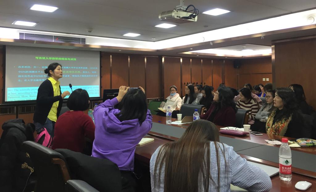 11月23日,厦门大学教育研究院郑若玲教授应邀作客学部教育史研究系列“元晖论坛”,为学部师生作了题为“高校招生中的统一考试与综合评价——从美国大学可免试入学改革谈起”的专题学术报告。报告会由学部教育史学科负责人曲铁华教授主持,师生互动环节由王凌皓教授主持。学部部分青年教师和学生参加了报告会。