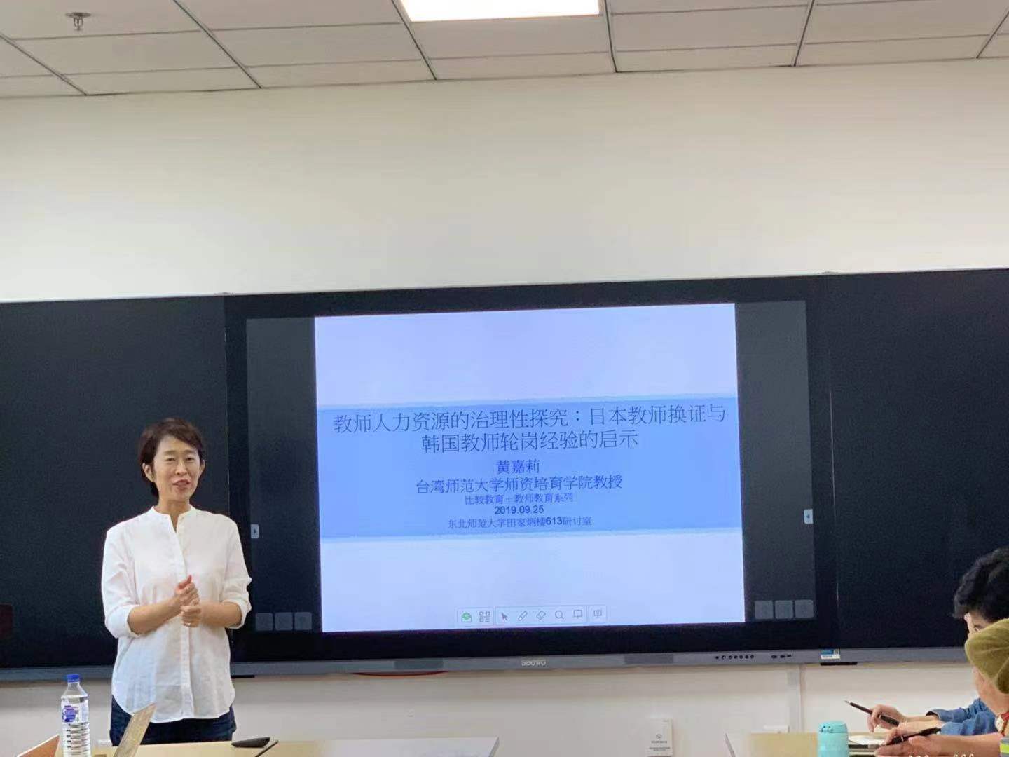 黄嘉莉教授以弱势学生群体的教育机会均等为切入点,围绕教师人力资源的治理性展开话题,论证了治理性分析的理论基础,分析了治理性在教师专业发展结构中的运用。随后她为了加深在场师生对这一主题的理解,分别阐述了日本教师换证制度和韩国教师轮岗制度,对两种制度的历史脉络、操作流程进行了梳理与介绍,并且对日本和韩国这两种制度进行了分析比较。黄嘉莉教授以诙谐幽默的言谈风格,循循善诱的教学方式,深深地吸引着在场的师生,现场互动频频,反响热烈。