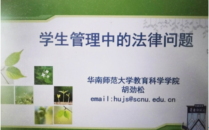 报告中,胡劲松教授围绕“学生管理中的法律问题”这一主题主要从教育权、管理学生和保护学生三个方面进行解析。特别强调了管理学生是基于对学习管理、组织管理和生活管理等方面的考量后最终落到对行为的管理上,学生的保护问题以及如何避免虐待学生等关键内容。报告内容系统、丰富且紧贴教育管理实践,对广大师生具有很好的针对性和启发性。在报告会的最后,与会师生就教育实践领域存在的教师申诉、学校的管理边界、学生体罚与惩戒的边界、学生处罚与青少年保护法的关系等问题与胡教授进行了深入的互动和思考。
