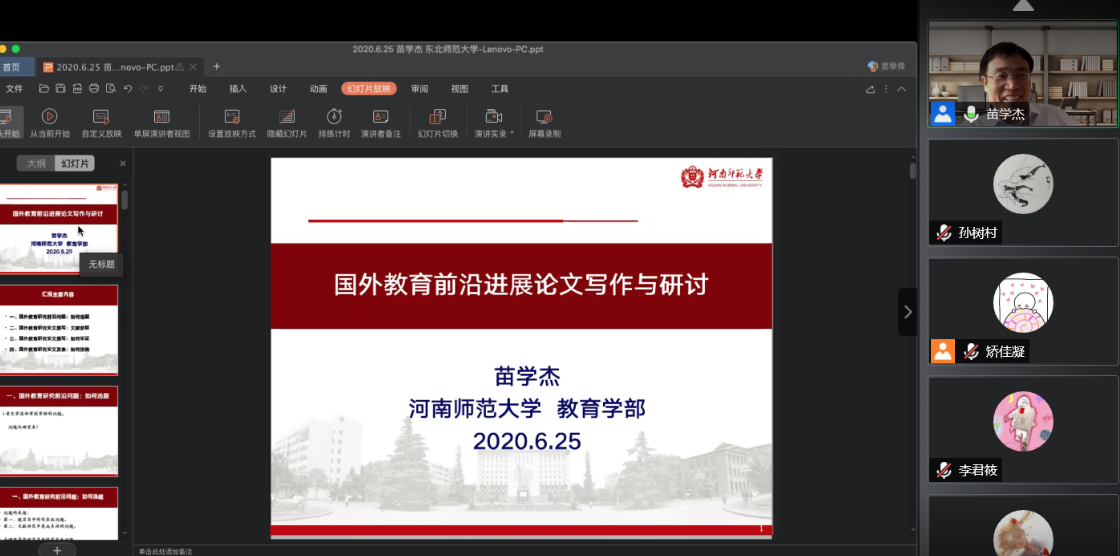 6月25日,河南师范大学苗学杰副教授应邀作客学部学前教育研究系列“元晖论坛”,为学部师生在线作了题为“国外教育前沿进展之论文写作与研讨”的专题学术报告。报告会由学前教育学院严仲连教授主持。