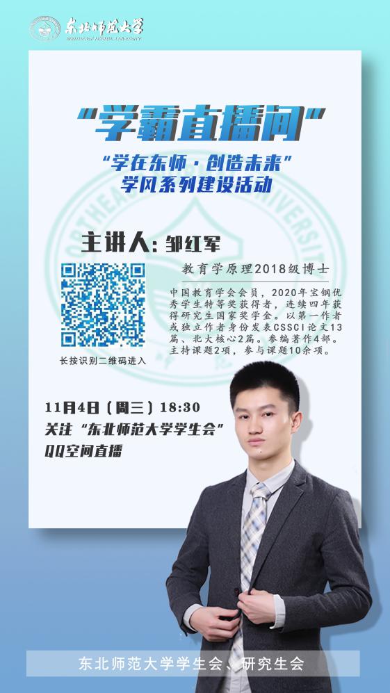 学习是立身之本,也是报国为民之基,为引导同学们找准学习方向、端正学习态度、优化学习方法,校学生会、研究生会联合举办了“学在东师·创造未来”学风建设系列活动,“学霸直播间”是其中重要组成部分。学部2018级教育学原理博士研究生邹红军受邀并作首期主讲,从阅读与写作的辩证关系、专业学习的问题与方法等方面与大家分享了自己的科研经历与学习体悟,并与在线观众进行了互动。本次直播吸引了线上1500多人次收看,受到广泛关注与好评。