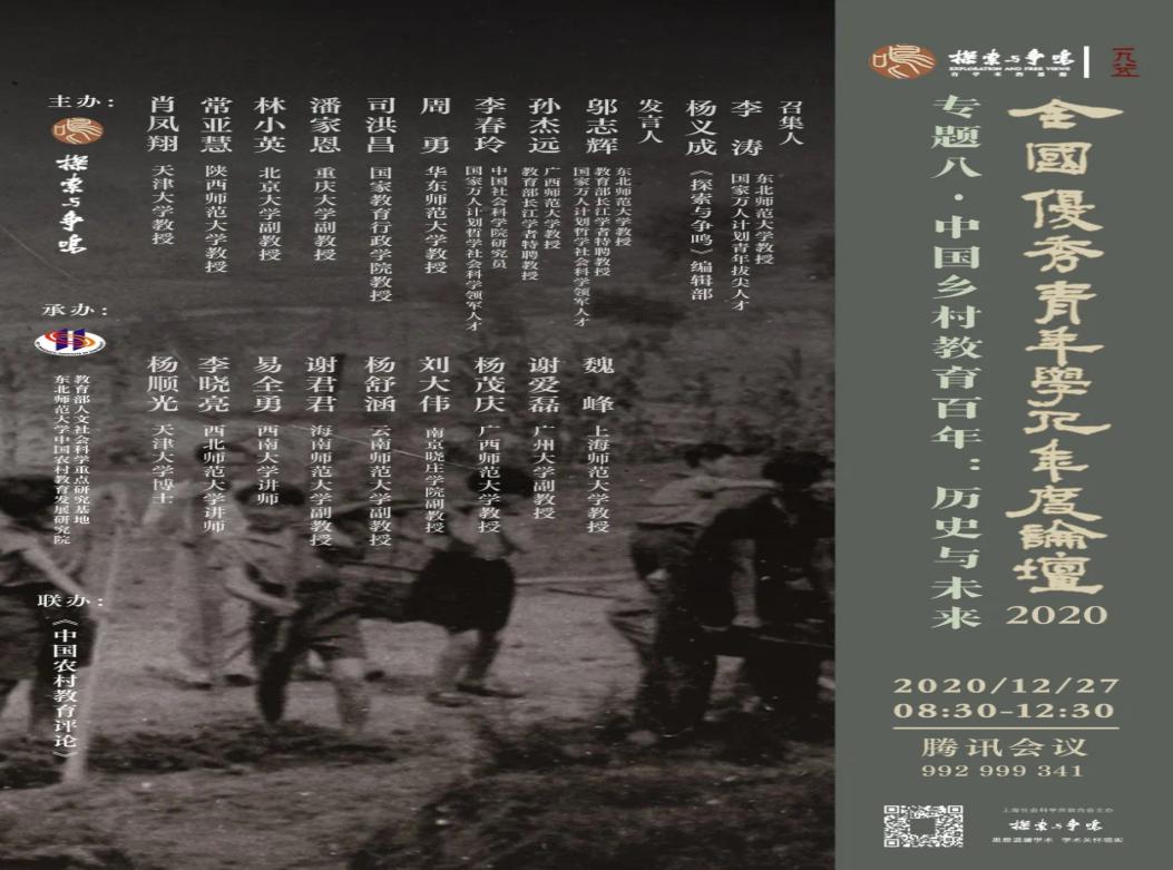 2020年12月27日,第一届全国优秀青年学人年度论坛“中国乡村教育百年:历史与未来”圆满召开。本次论坛由上海社联《探索与争鸣》编辑部、教育部人文社会科学重点研究基地304永利集团中国农村教育发展研究院共同主办,中国教育学会农村教育分会会刊《中国农村教育评论》联合参办。本论坛召集人为国家-青年拔尖人才李涛教授和《探索与争鸣》编辑部杨义成编辑。包括国家-哲学社会科学领军人才、教育部长江学者特聘教授在内的400余名来自全国高校、科研机构、学术期刊社的专家学者参与研讨,通过腾讯会议形式共聚云端,共话乡村教育百年议题。