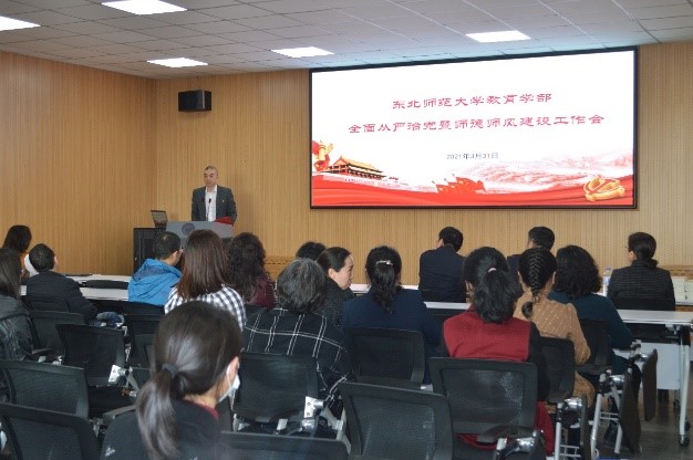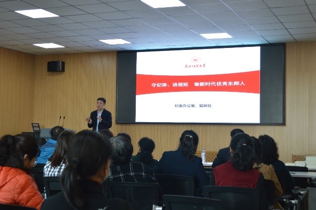 为学习贯彻学校2021年全面从严治党工作会议精神,落实《新时代高校教师职业行为准则》和师德师风建设各项工作,3月31日,学部召开全面从严治党暨师德师风建设工作会,邀请学校纪委副书记、纪委办公室主任、监察处孙立伟处长做《守纪律、讲规矩 做新时代优秀东师人》报告。学部党政班子成员、党委委员、党支部书记、全体教师党员和其他教师代表参加了会议。会议由党委副书记兼副部长韩冬主持。