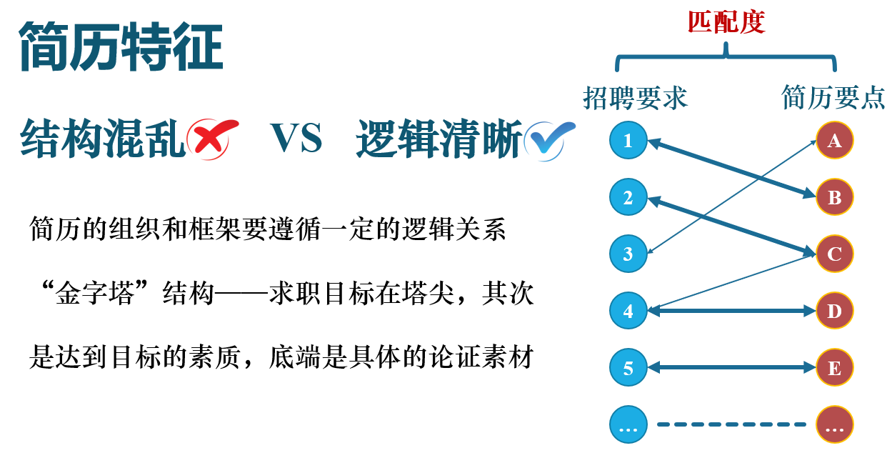 首先,刘老师以“简历是有针对性的自我介绍的一种规范化、逻辑化的表达”出发,以“人岗匹配”理论的角度说明制作亮眼简历的重要性。