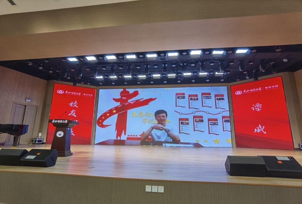 校友代表四川省成都市泡桐树小学谭威老师首先表达了对毕业生的祝贺,并为站在人生岔路口的同学们提出了三点宝贵的建议,他建议大家选定脚下的路,坚持选定的路,同时热爱选择。最后,他祝愿毕业生们人生路途坦荡,未来星辰大海。