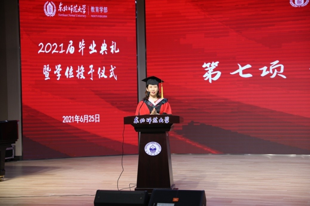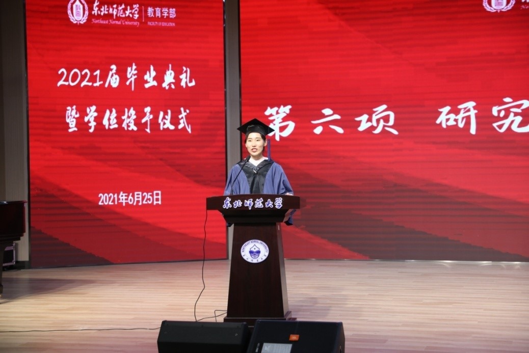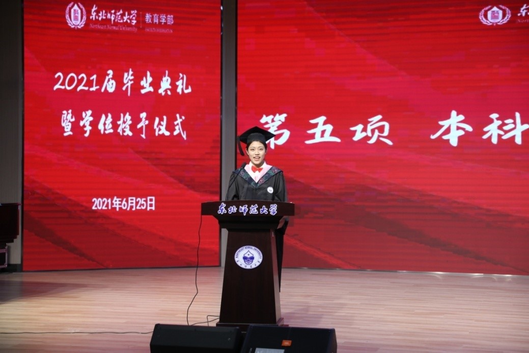 而后,2021届小学教育专业本科毕业生刘子绮、学前教育学专业硕士毕业生代表张雅倩分别作为2021届本科生毕业生代表和研究生毕业生代表发言。他们讲述了关于对毕业的感悟和未来的期望,表示将会在实践中努力践行“行胜于言”的部训,带着学部老师的谆谆教诲、求真务实的做人态度、严谨踏实的治学精神,坚守、秉持教育初心,努力做基础扎实的求学者,做有报国志向的教育人。