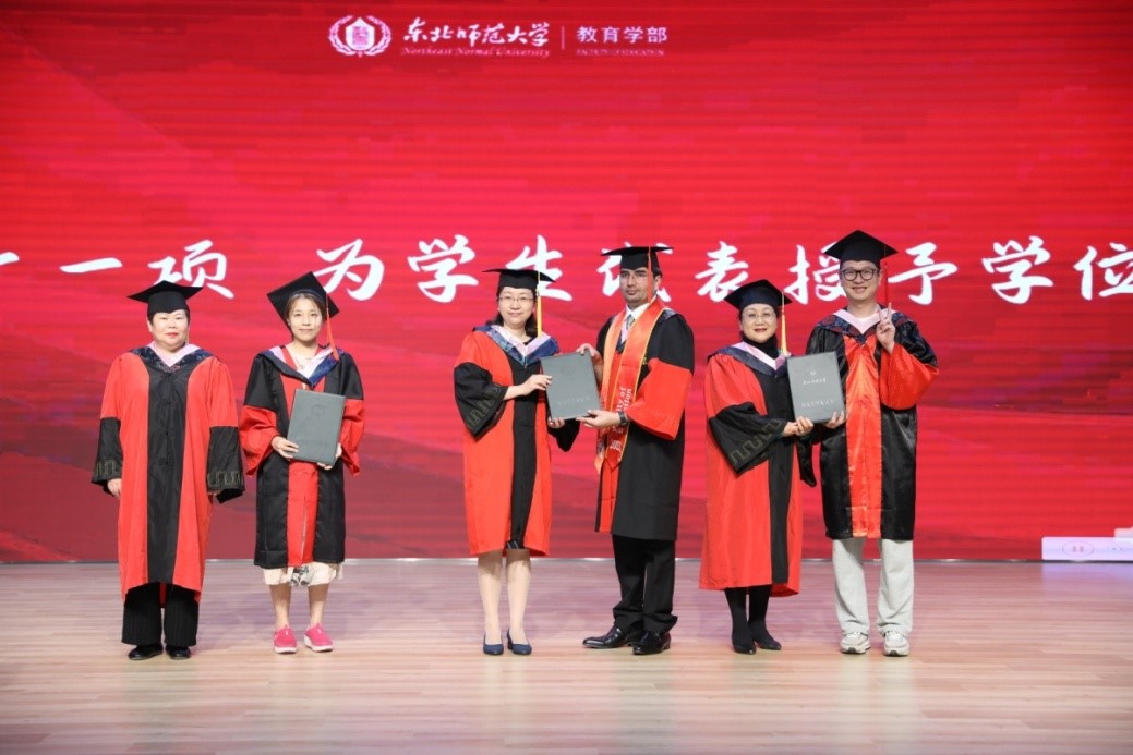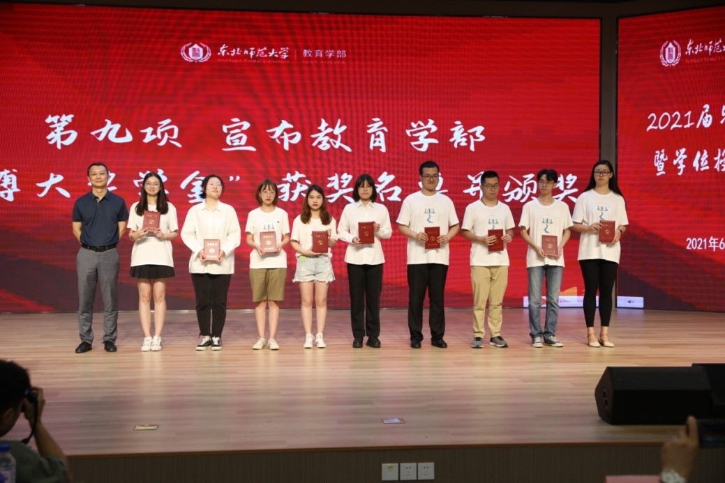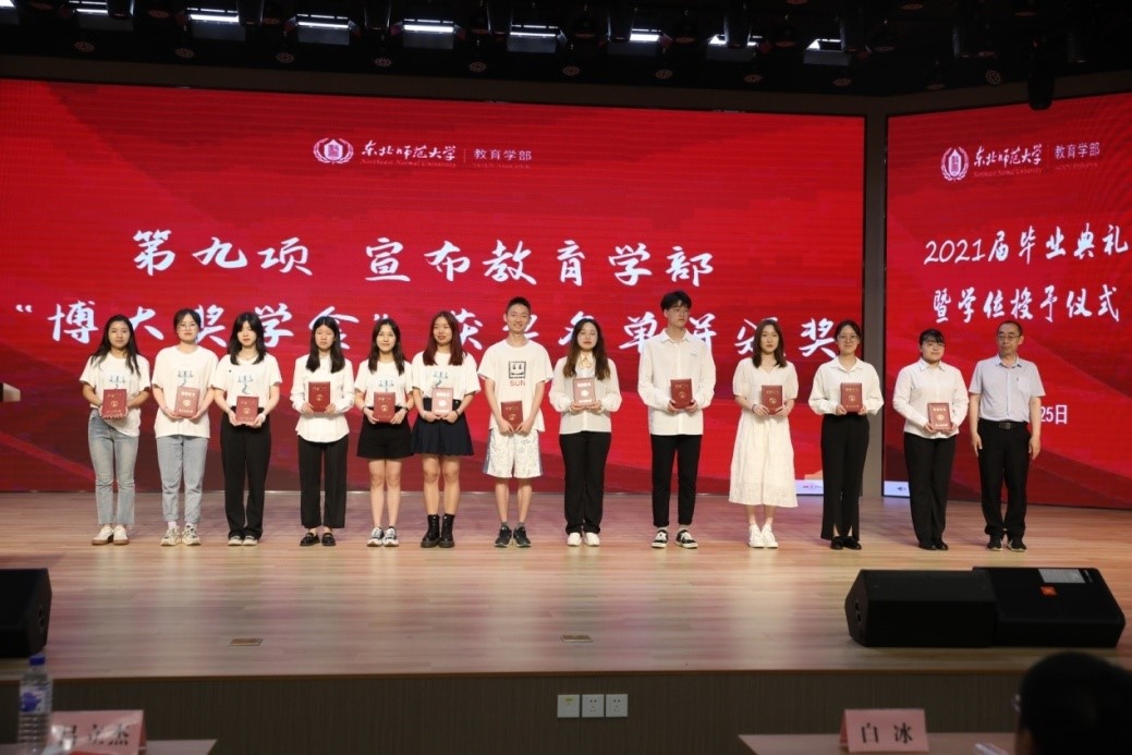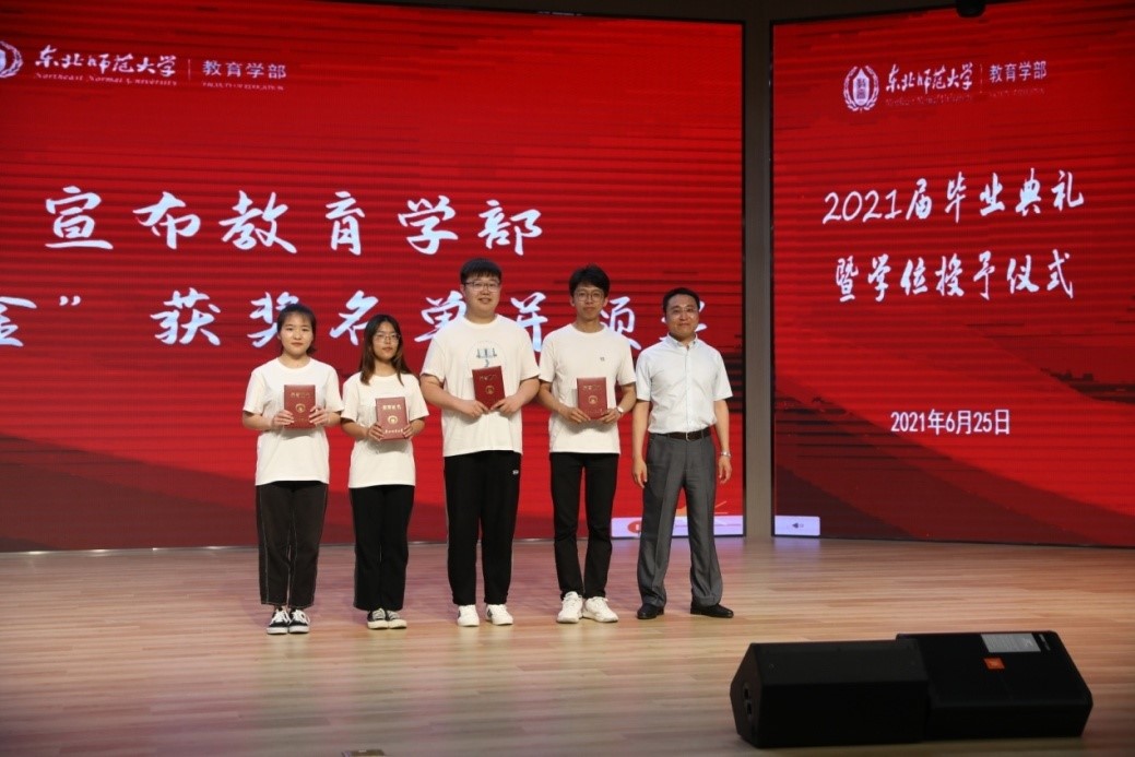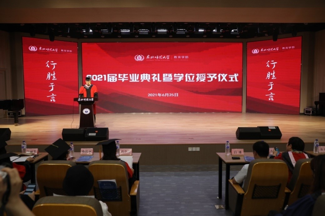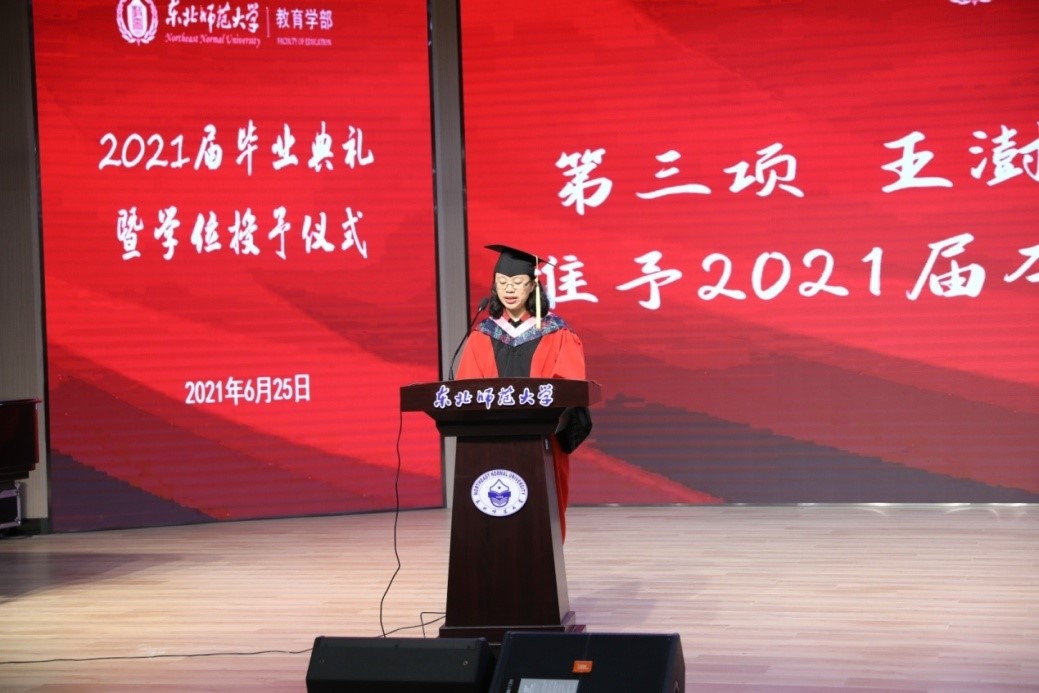 随后,由学部吕立杰教授、曲铁华教授、王小英教授为获得2021届博士学位、硕士学位、学士学位的学生授予学位并颁发证书。学部全体毕业生身着学位服,列队依次走上典礼台,每名毕业生脸上都洋溢着幸福和自豪,流露出对师长的浓浓感激之情。