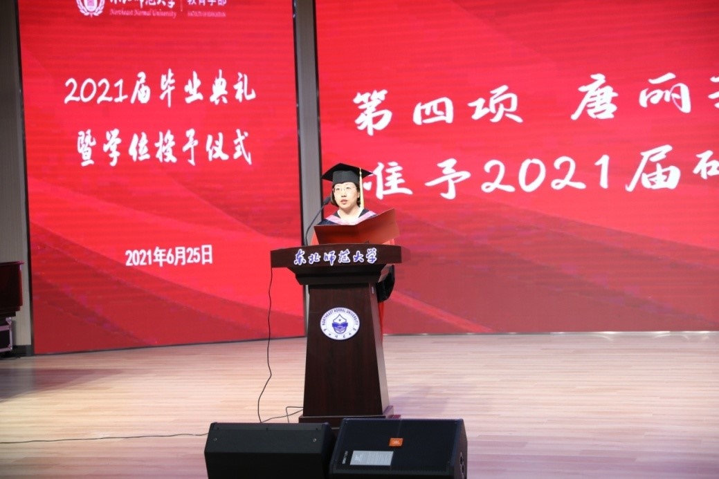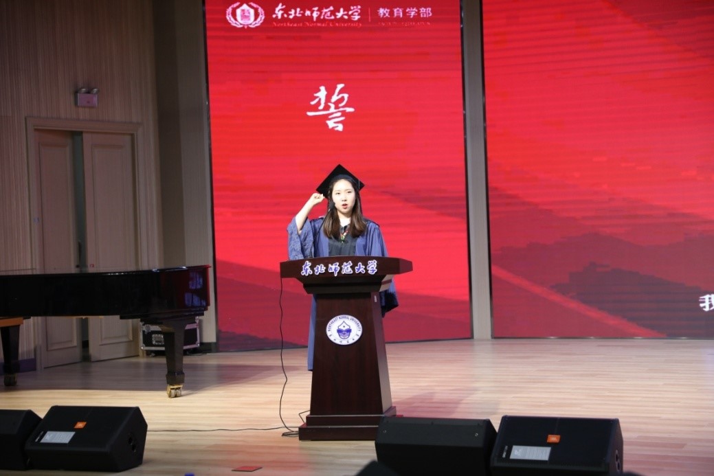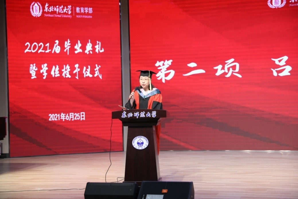 而后,在2021届小学教育专业硕士毕业生韩佳妤的领誓下,学部全体毕业生用饱满的热情,激昂的声音庄严地进行毕业宣誓:“以我之热情,使学生更幸福!以我之努力,使学校更美丽!以我之责任,使国家更强盛!我将恪守誓言,铭记东师精神,铸造学部师魂!”。