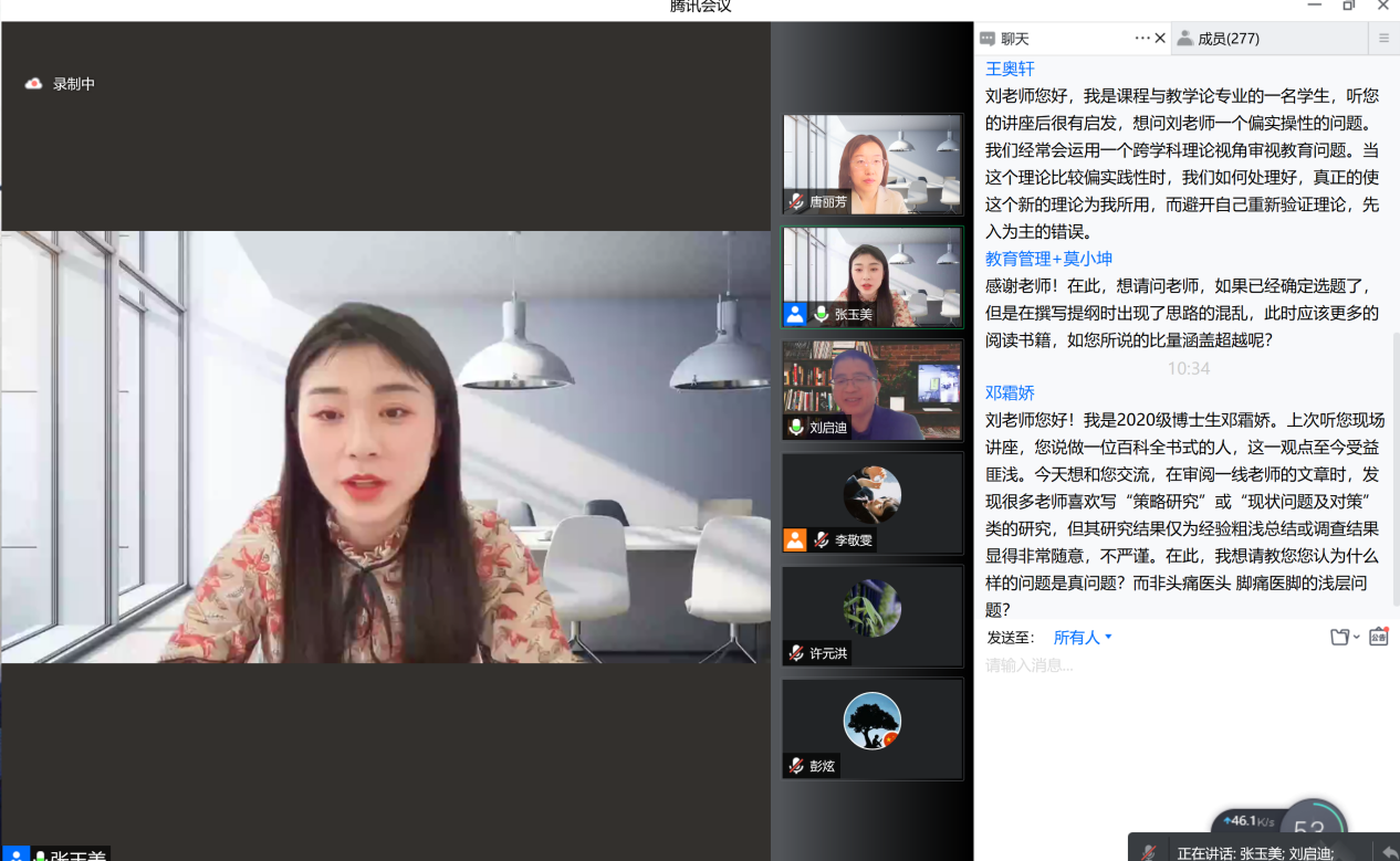互动交流环节,主持人张玉美与刘老师就现阶段制约中小学教师科研表达水平提升的因素及破解方式等问题展开了讨论,刘老师充分肯定并逐一进行了回答。随即,云端上的众多学子积极地就选题视角的切入、研究方法的运用等问题向刘老师请教,刘老师耐心地给予了答复,并鼓励大家要“找真问题”、“写好文章”。