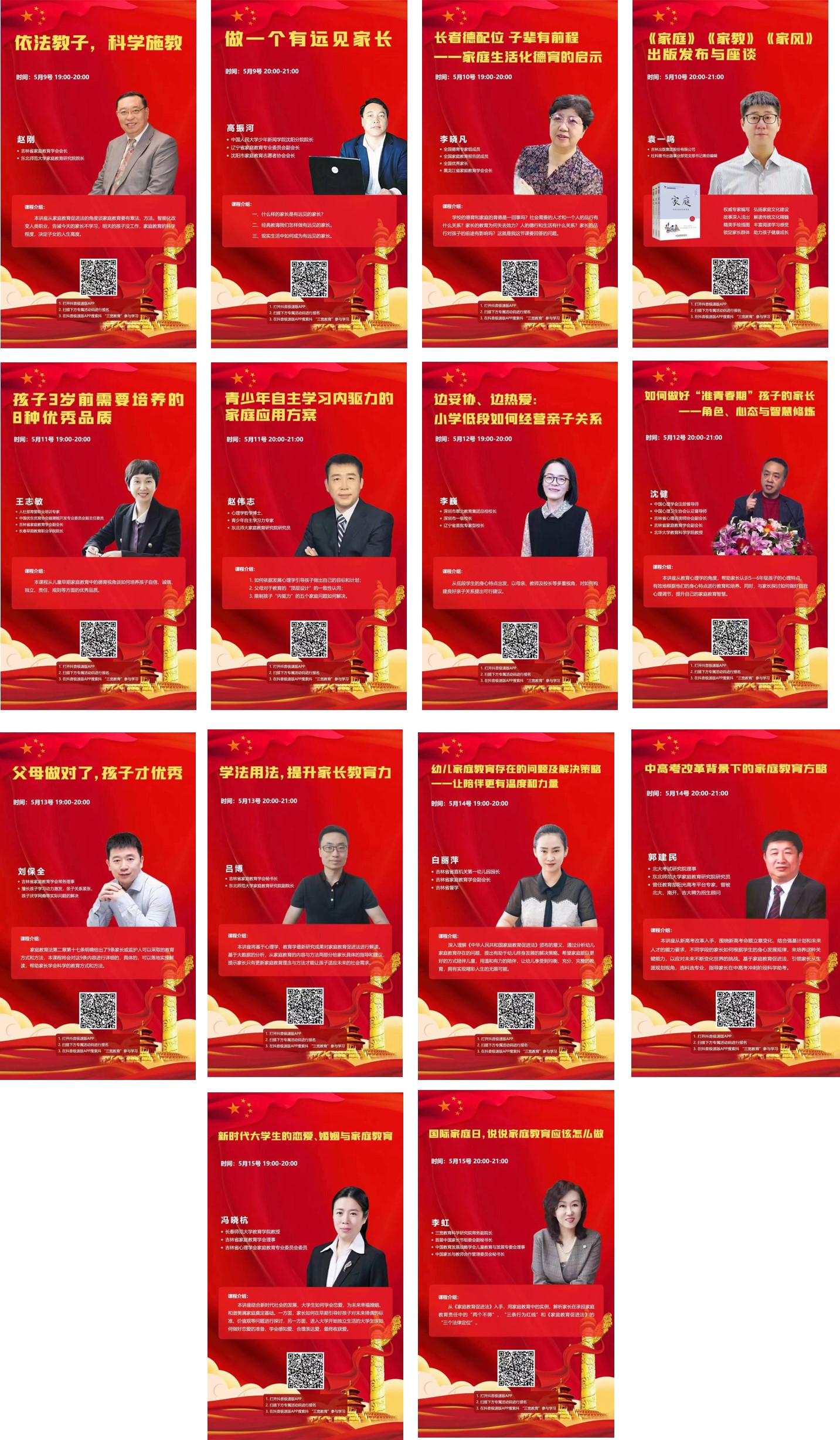 5月9日—15日,为贯彻《中华人民共和国家庭教育促进法》和全国妇联、教育部、中国关工委等十一部委《关于指导推进家庭教育的五年规划(2021—2025)》精神,由304永利集团家庭教育研究院、中国家长与教师合作管理委员会、东北三省家庭教育联合体、北京三宽教育科学研究院等单位联合发起的“家教有法,教子有方”专家大讲堂活动在抖音极速版直播平台上线发布。期间,每天两场次直播,内容包括家庭道德教育、儿童学习力培养、亲子关系、亲子陪伴等多个领域,涵盖了从婴儿到大学生阶段的家庭教育指导,在抖音平台引发了广大家长的热烈反响。