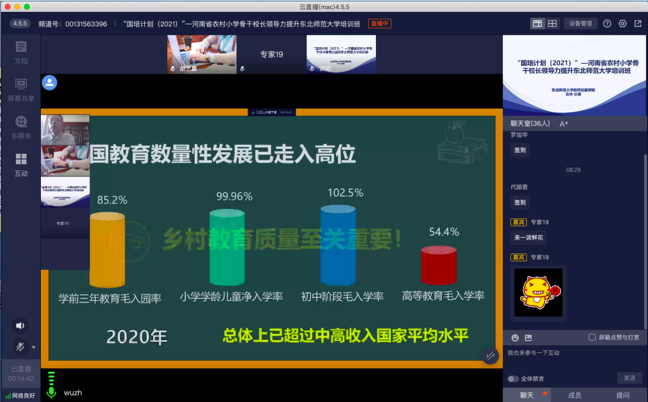 为了更好地满足学员个性化学习需求,精准施培,本次培训充分利用学校师资优势,邀请柳海民、杨卫安等10位专家组成理论导师团队,为学员进行一对一指导和答疑,获得学员一致好评。学员表示,导师指导理论联系实际,非常接地气和实用,通过导师指导,对学校未来发展和问题解决有了更清晰的思路和认识。同时,为了克服线上培训的不足,本次培训强化线上参与式培训,凸显“学校云参观”、“名校长对话”、“问卷+实时提问”双重提问模式等,充分调动学员参与的积极性,引发学员思考和对话的主动性,取得良好成效。