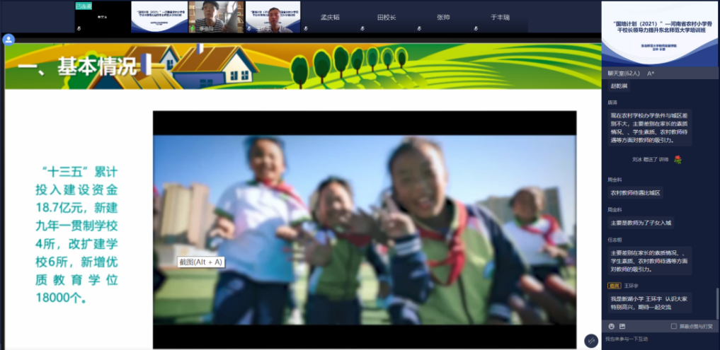 培训班本着“尊重、唤醒、引领、助力”的培训理念,彰显学校“为基础教育服务”的办学特色,采用在线异步研修与同步直播、在线同步研讨与个性化指导相结合的培训模式。培训以农村小学学校发展规划制定和文化建设为核心,围绕“学校发展规划制定”、“学校文化与农村学校特色发展”、“学校课程建设与劳动教育实施”、“学生培养”、“教师队伍建设”、“校长信息领导力提升与团队建设”、“校本教研改进”、“依法治校与安全管理”等领域,共邀请国内高校知名专家学者、各省一线名校长和往届优秀学员近50人次,通过前置学习、专题讲座、在线同步答疑、导师指导、学校云参观、名校长对话、案例分析、锵锵三人行、圆桌论坛、学校故事汇、学员微课程等多种形式,引领学员把握国家教育改革最新政策和新课标精神,更新教育观念和管理理念,丰富规划学校发展与文化建设的专业知识、理论与方法,提升规划学校发展、建设学校共同愿景、引领课程与教学改革、创造性落实国家教育方针和各项政策的能力,提高学校办学品质。