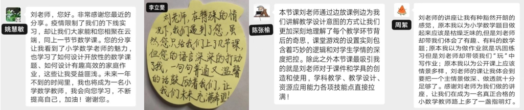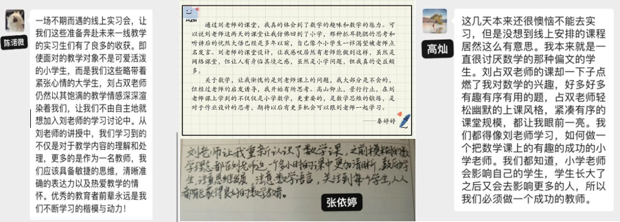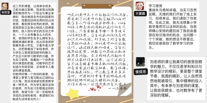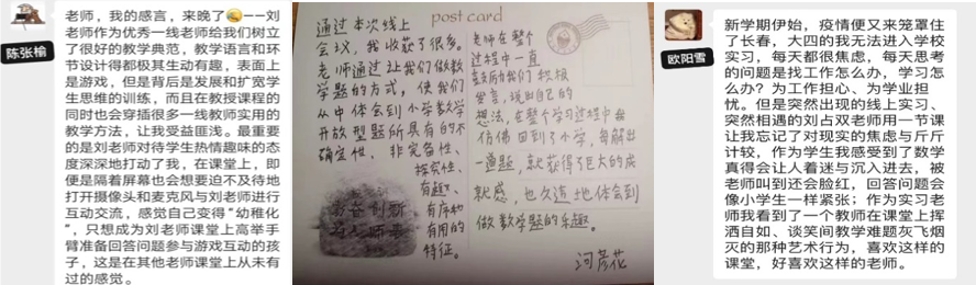 刘老师带领名师工作室团队连续几天,分别指导我们如何进行小学数学教学设计如何进行小学数学作业设计、如何设计小学数学开放题。刘老师深入浅出的讲课风格、幽默诙谐的说话方式给同学们带来了不同以往的学习感受,他的线上实习指导课特别有带入感,让我们每个同学都能全情投入,虽然隔着屏幕,但一点都没影响我们与刘老师的积极互动交流,通过一个又一个的系列问题,让我们感悟到小学教育教学的精髓。原本没下校去实习的遗憾心情,被刘老师线上的精心指导治愈了。大家纷纷表示这次临时的线上实习指导受益匪浅,收获的不仅仅是教育教学的一些道理与方法,同时大家也感受到一个特级教师榜样的力量,让大家更坚定了努力成为卓越教师的理想信念。看看同学们的留言,就知道这次不期而然的线上实习有多么的精彩了。