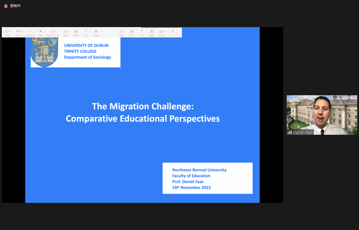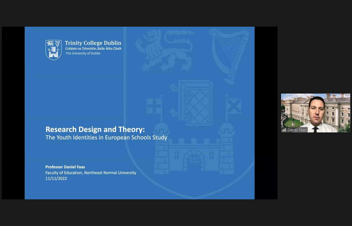 2022年11月11日和18日,学部邀请爱尔兰都柏林圣三一大学Daniel Faas教授作客学部“元晖论坛”,通过线上平台(ZOOM会议)为学部师生作了题为“Research Design and Theory: The Youth Identities in European Schools Study”和“The Migration Challenge: Comparative Educational Perspectives”的学术报告。报告会由朱红教授和外籍教师Cormac Mc Namara博士主持,学部留学生100余人次参加。
