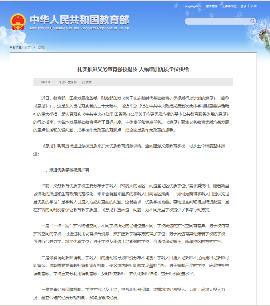 原文链接:刘善槐:扎实推进义务教育强校提质大幅增加优质学位供给(http://www.moe.gov.cn/jyb_xwfb/moe_2082/2023/2023_zl13/202308/t20230831_1077545.html)