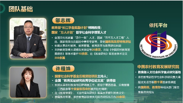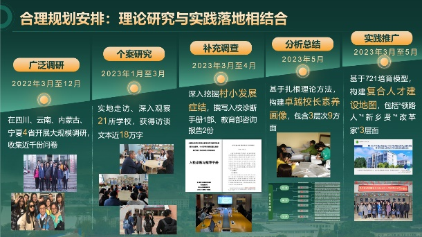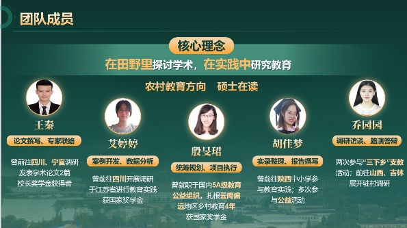 该参赛项目由学部教师邬志辉教授、许程姝老师全程指导,项目成员由殷旻珺、艾婷婷、胡佳梦、乔园园、王秦五位研究生组成。2022年3月至2023年8月,项目团队在四川、云南、内蒙古、宁夏4省开展大规模调研;实地走访、深入调查21所乡镇学校,获得访谈文本18万字;深入挖掘乡村学校发展症结,撰写入校诊断手册1部、咨询报告2份。项目团队运用扎根理论方法,构建卓越校长素养画像,基于卓越校长人才培育模型,构建包括“领路人”“新乡贤”“改革家”的复合人才建设地图。