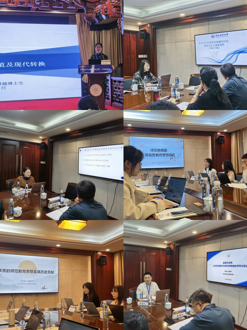 在第二分论坛上,王凌皓教授作了《中国传统学徒制的内在价值及现代转换》的报告,主要对我国古代社会传统学徒制的内涵及其在现代社会的重要价值进行了论述。在第四分论坛上,李娟副教授作了《走向日用之道——<急就篇>中的博物教育》的报告,主要内容为蒙书《急就篇》中的具体内容、编排结构、道德内涵等。学部博士研究生张诗妍、于静滢、龙奕帆、蒋丽萍分别作了题目为《诗意地栖居:陈衡哲教育思想研究》《论北宋庆历兴学期间官学制度创新》《李蒸的师范教育思想及其历史贡献》《中小学音乐课程发展嬗变历程、特质、及启示镜鉴探析(1902-1948)》的报告,硕士研究生高海冰作了题目为《启蒙与求索:近代科学教科书中科学观的意涵与书写》的报告。