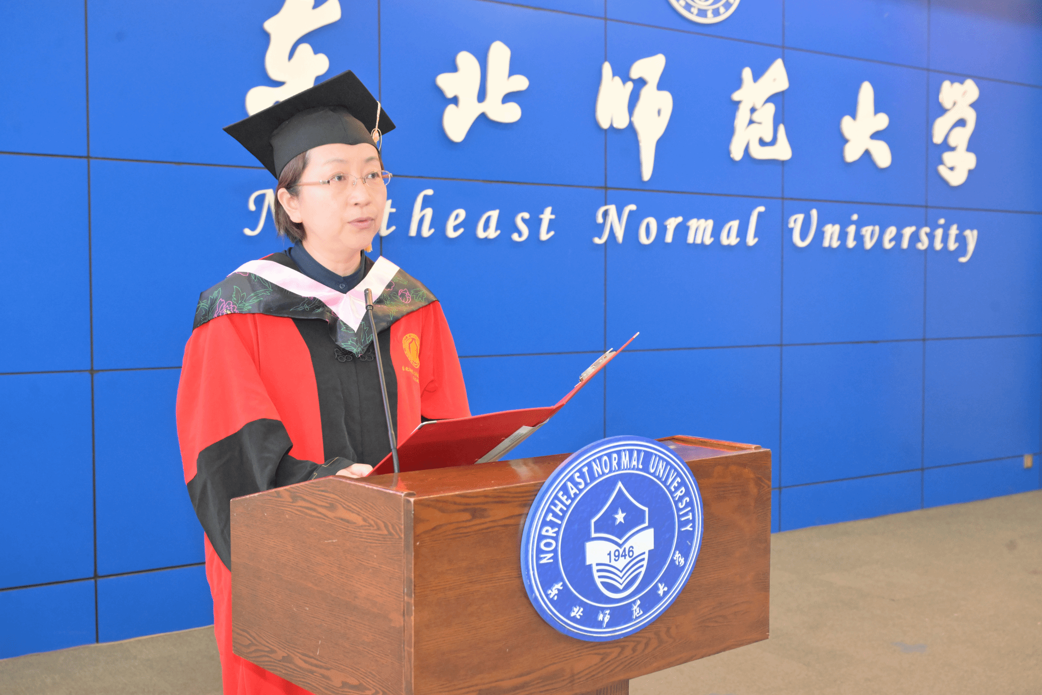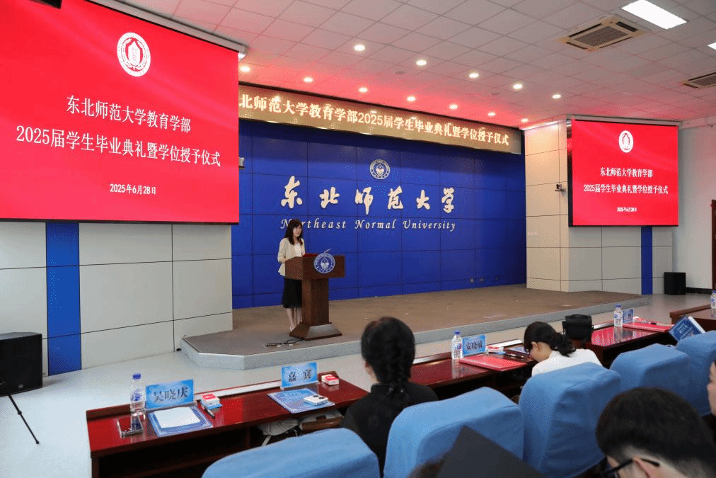 中国农村教育发展研究院安晓敏教授代表学部全体教师向圆满完成学业的同学们表示了热烈的祝贺,并提出三点期许:一是终身学习:毕业证书非终点,自主学习是面对不确定未来的武器。二是甘于平凡:教育是平凡中的伟大,忠于内心、脚踏实地,平凡工作亦可照亮他人。三是不负时代:身处AI变革时代,要做参与者而非适应者,坚信教育的温度与情感链接不可替代,坚守育人初心,敬畏生命,保持耐心。最后,她勉励全体毕业生带着“勤奋创新、为人师表”的东师精神,不忘初心,砥砺前行。