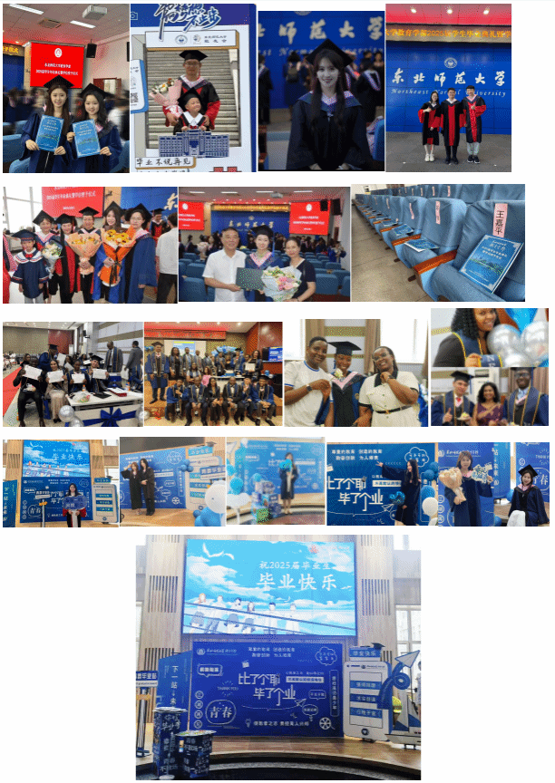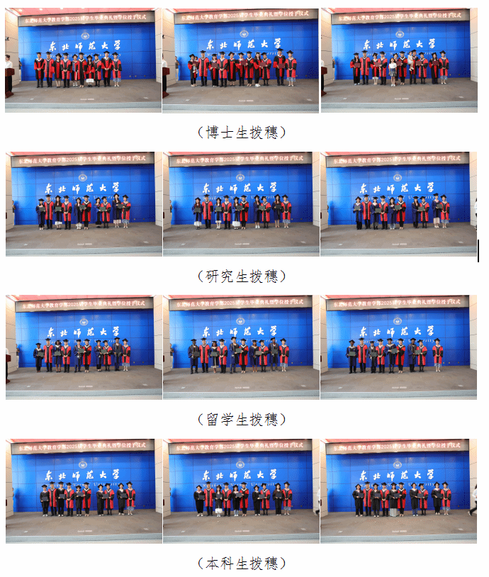 吕立杰、秦玉友、曲铁华、石艳、杨卫安五位老师为获博士学位、硕士学位、学士学位的2025届毕业生拨穗授位,学术袍与学位帽汇成知识海洋。