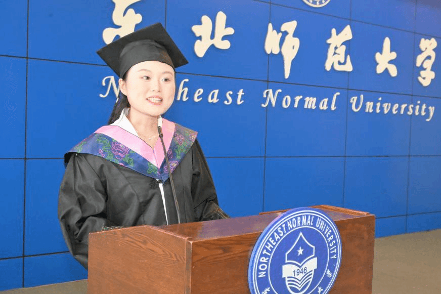 本科生代表、2021级教育学专业本科毕业生罗红梅发言。她回顾了从教育“门外汉”到独立思考“教育人”的成长历程,体悟到教育不仅需要满腔热忱,更需严谨务实的态度。她分享了赴京研学资助育人和在家乡四川冒雨支教的难忘经历,也唤起同学们对军训、打雪仗、线上学习等共同记忆的共鸣。最后,她表达了对母校、师友及家人的感恩,并号召全体毕业生带着师大力量启程,用各自微光点亮教育强国梦想。