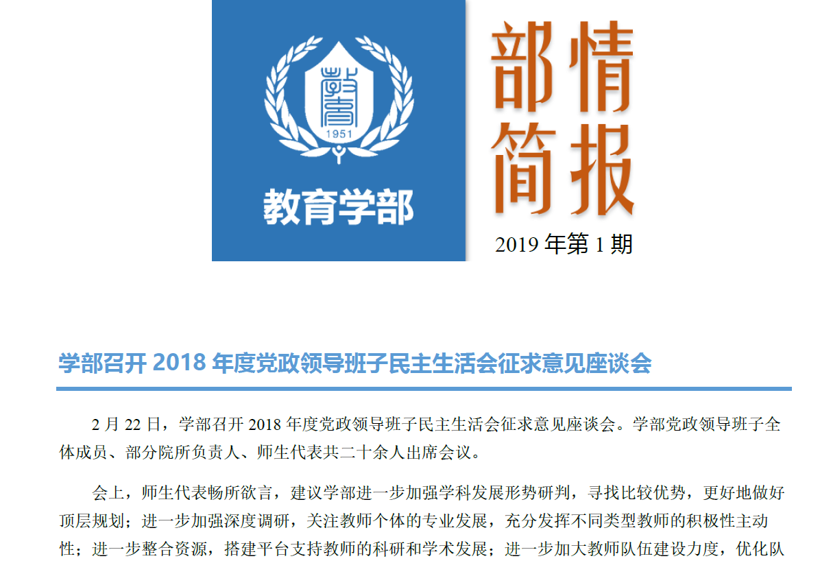 根据开学初领导班子民主生活会征求意见座谈会上,部分教师提出关于“完善信息通报制度”的建议,经学部党政班子研究,决定从本学期开始启动《部情简报》工作,定期向全体教师通报近期学部主要工作。可以通过登陆智慧学部系统或查收邮件的方式查看。