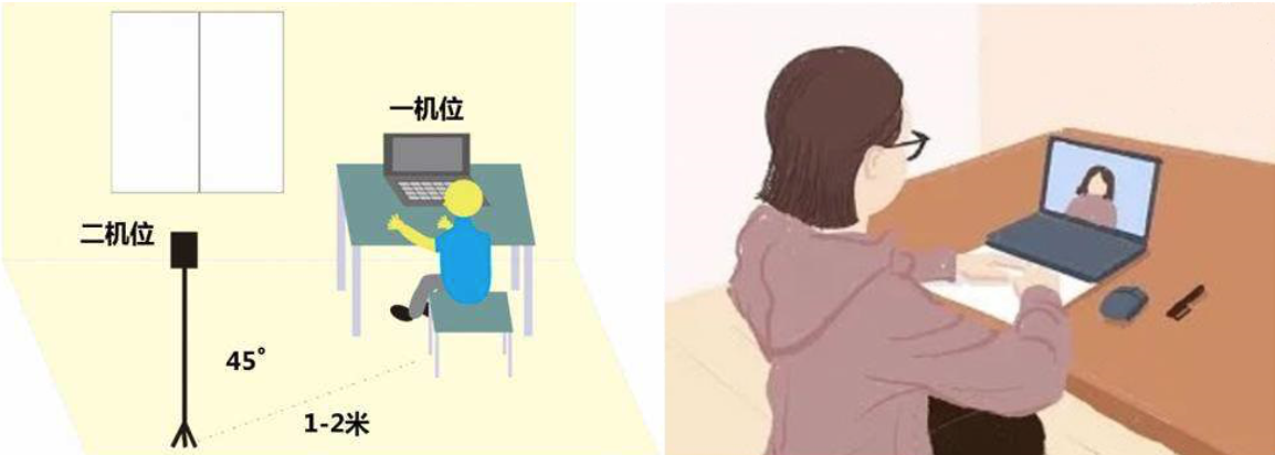 2.二机位设备应架设在桌面侧后方(45°)1-2米位置。设备要高于桌面,垂直角度约30°,即能够完整展示考生状况和桌面环境(桌面仅可放置身份证和《报名信息表》)。请按以下示意图做好设备架设和拍摄视角调整。