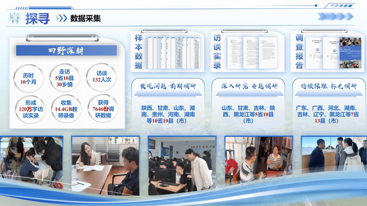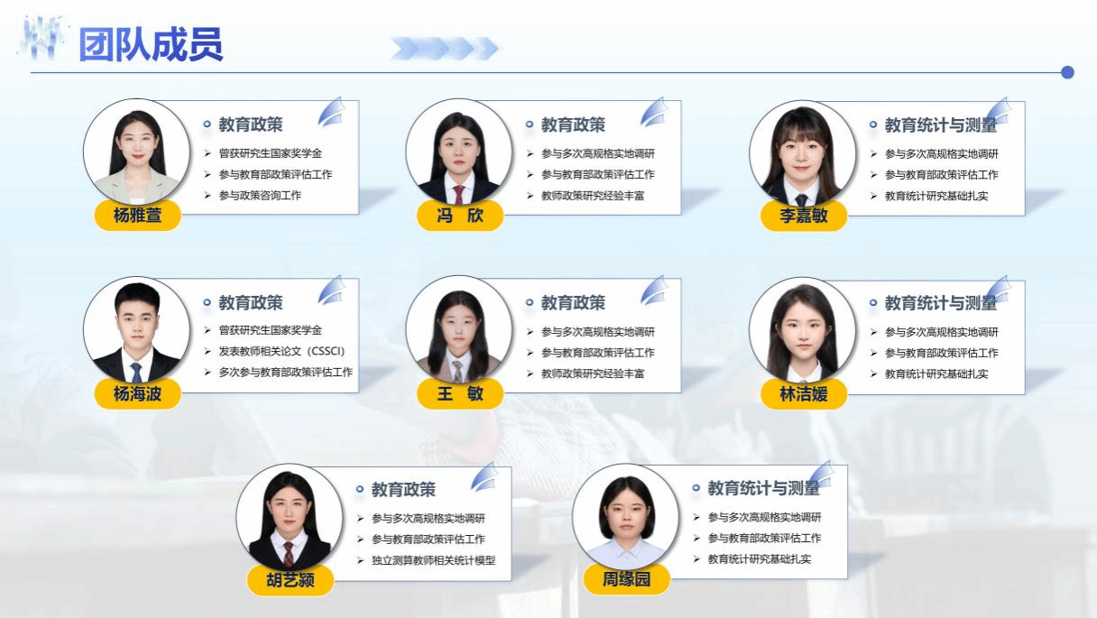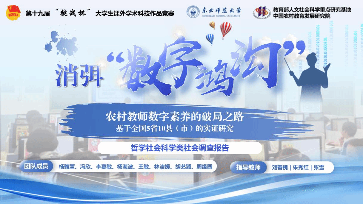 该项目由刘善槐教授、朱秀红副教授和张雪副教授指导,项目成员由杨雅萱、冯欣、李嘉敏、杨海波、王敏、林洁媛、胡艺颍和周缘园八位研究生组成。项目立足建设教育强国需要,探讨跨越城乡“数字鸿沟”的关键环节——提升农村教师数字素养。项目成员深入东中西部地区的5省10县(市)开展大规模实地调查,采集一手调查数据7646份,科学诊断农村教师数字素养的现实水平,深入挖掘农村教师数字素养的关键影响变量,系统构建农村教师数字素养提升的政策支持体系,撰写形成总调研报告1份、分省诊断报告5份,受教育部相关司局邀请参与教育数字化相关政策的评估工作,并将研究成果贡献于吉林省本土教育政策的研制。