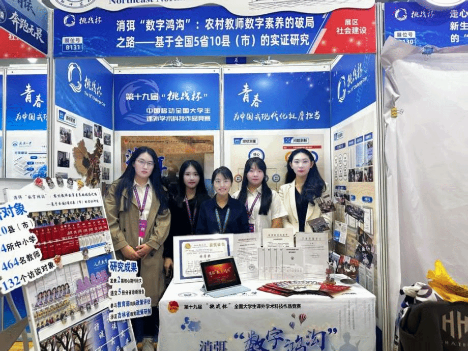 2025年11月1日—3日,由共青团中央、中国科协、教育部、中国社会科学院、全国学联共同举办的第十九届“挑战杯”全国大学生课外学术科技作品竞赛决赛在南京大学隆重举办。本届竞赛共吸引全国2000多所高校、40余万作品、250多万学生参赛。学部学子与来自北京航空航天大学、上海交通大学等高校的1283个终审决赛项目同台竞争,凭借作品《消弭“数字鸿沟”:农村教师数字素养的破局之路——基于全国5省10县(市)的实证研究》成功脱颖而出,获得国家一等奖,取得学部在该项赛事上的历史性突破。