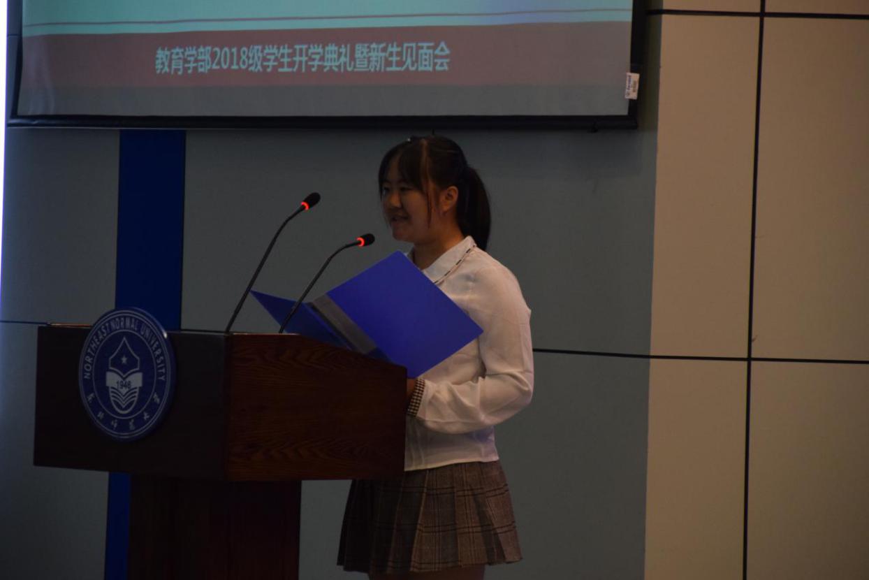 2018级教育学类本科生董玥彤、教育经济与管理专业研究生肖林硕代表新生发言。他们表达了能够考入304永利集团的骄傲和自豪,表示会铭记东师“勤奋创新,为人师表”的校训,严于律己、遵规守纪,为祖国的教育事业发展服务。在今后的学习中,要励精图治,勤奋创新,把汗水挥洒在学业攀登的路上。