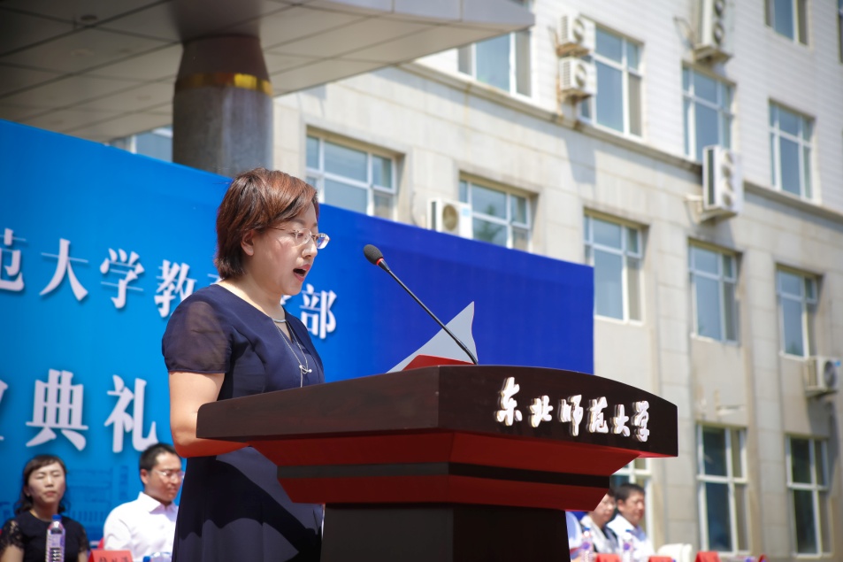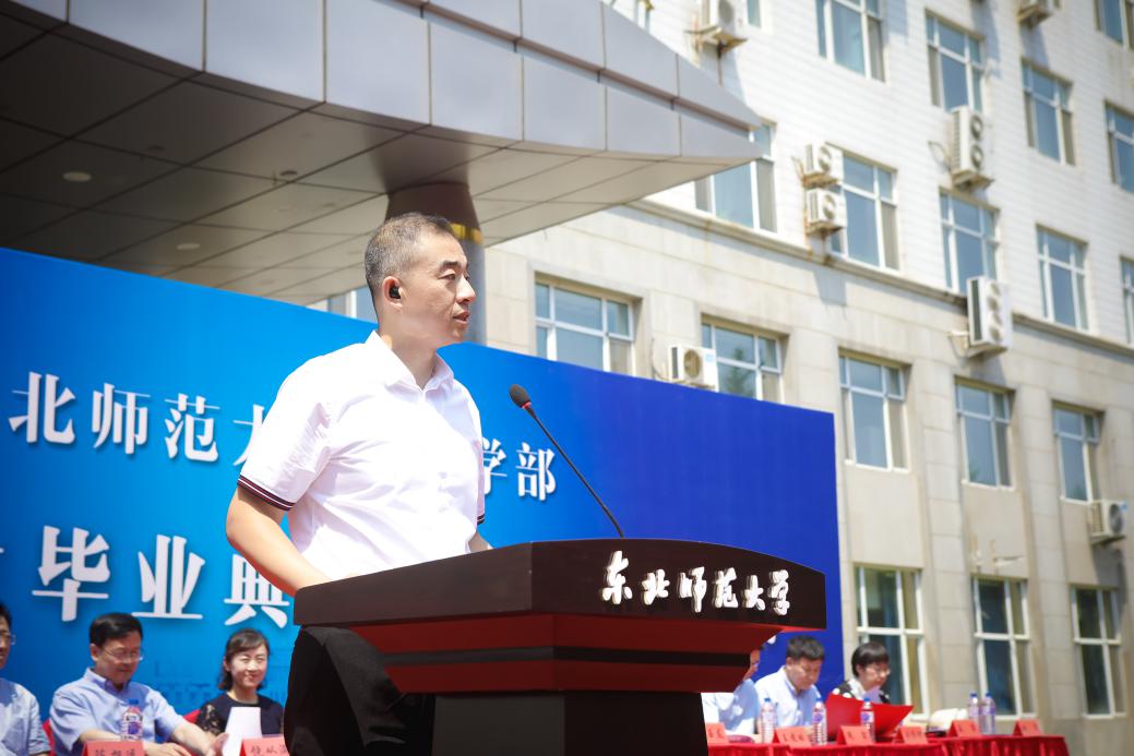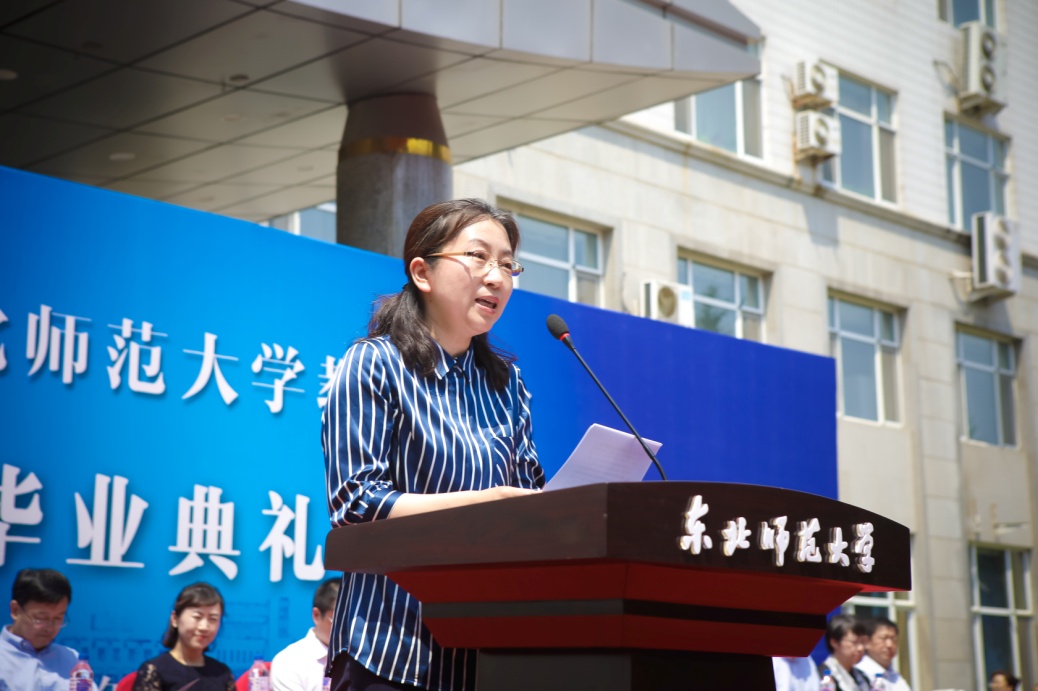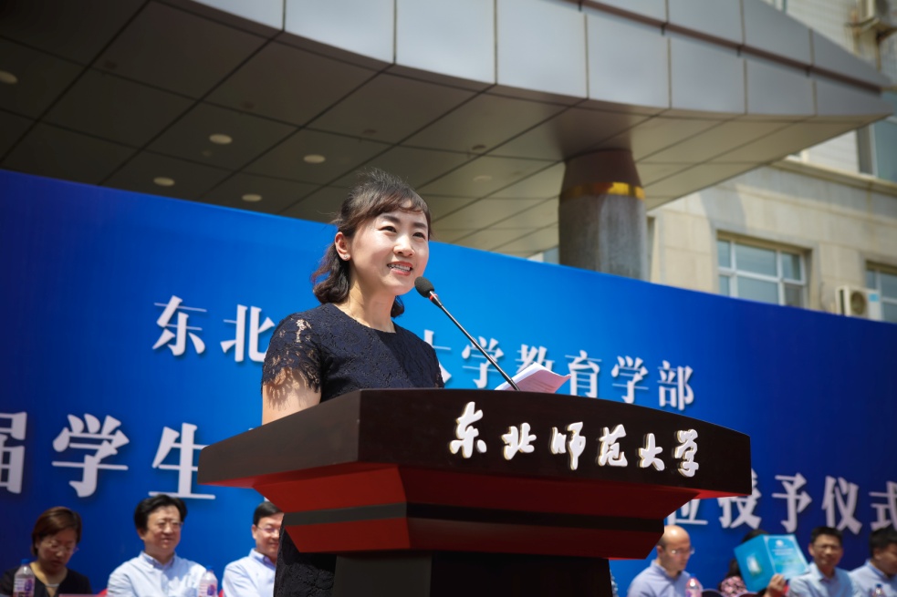 校友代表、2003届小学教育专业首届毕业生、东师中信实验校团委书记兼学生工作部副主任、吉林省语文学科骨干教师李颖老师表达了对未来教师们的殷切期盼,对学部的感恩与怀念,希望每一位师弟师妹能够永远不要忘记为什么而出发,胸怀饱满热情,投入未来的学习与工作当中,以积极的态度面对生活。“你有多爱学生,你就会成为多优秀的老师。”