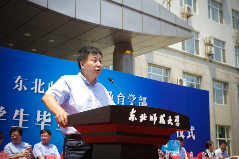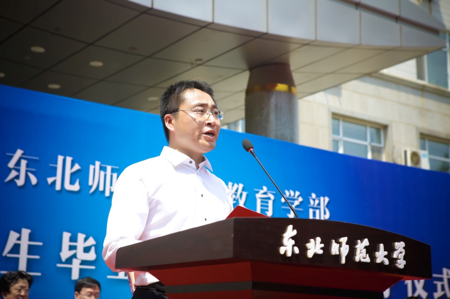 学部教师代表、初等教育学院院长刘学智教授为全体毕业生带来毕业寄语。他告诉毕业生,要做到不忘初心,守住信念;扎实工作,乐观豁达;敢于担当,认真负责;熟思慎行,不骄不躁;直面困难,积极向上;学会感恩,回报母校,要做一个有利于社会、有利于人民的好教师,热爱工作、热爱学生。