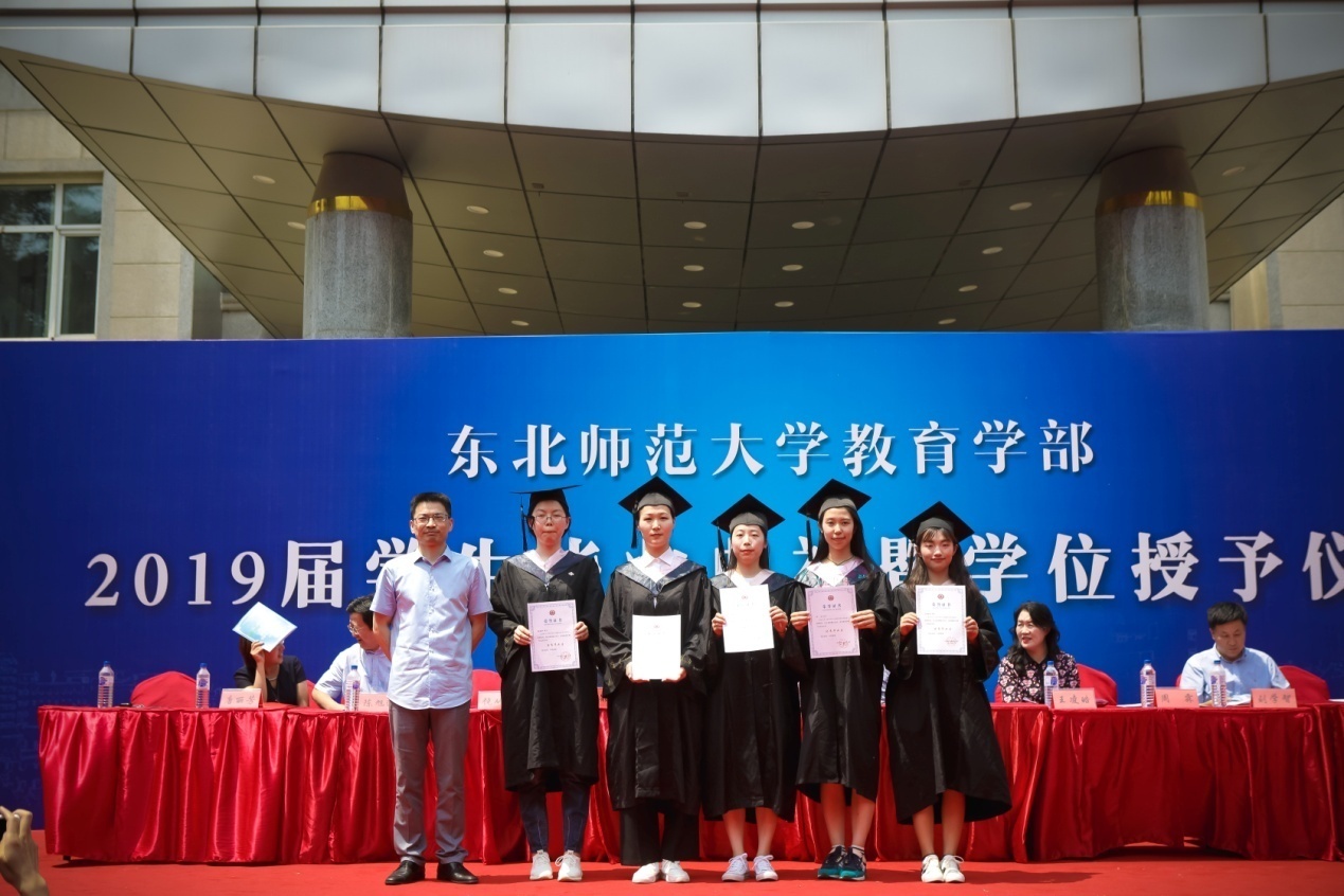 当主持人宣布由学位评定委员会吕立杰教授、饶从满教授、秦玉友教授、王萍教授为获得2019届博士学位、硕士学位、学士学位的学生授予学位并颁发证书时,全场响起了热烈的掌声。学部全体毕业生身着学位服,列队依次走上典礼台的红地毯,由学部四位教授为他们授予学位并合影留念。每名毕业生脸上都洋溢着幸福和自豪,流露出对师长的感激之情,台下的家长、同学也难掩激动,时不时爆发出祝贺的掌声、欢呼声,大家纷纷拿起相机记录这人生中庄严而又幸福的时刻。