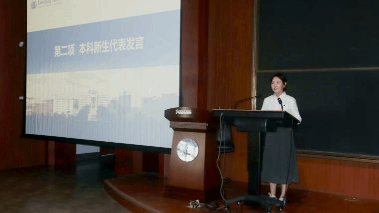 新生代表、2025级博士研究生高海冰发言。他表示要向下扎根,打下坚实的科研基础,向上生长;向前追光,具备敢于创新的意识和勇气;学会生活,将生活的各个方面都描绘得绚丽多彩。